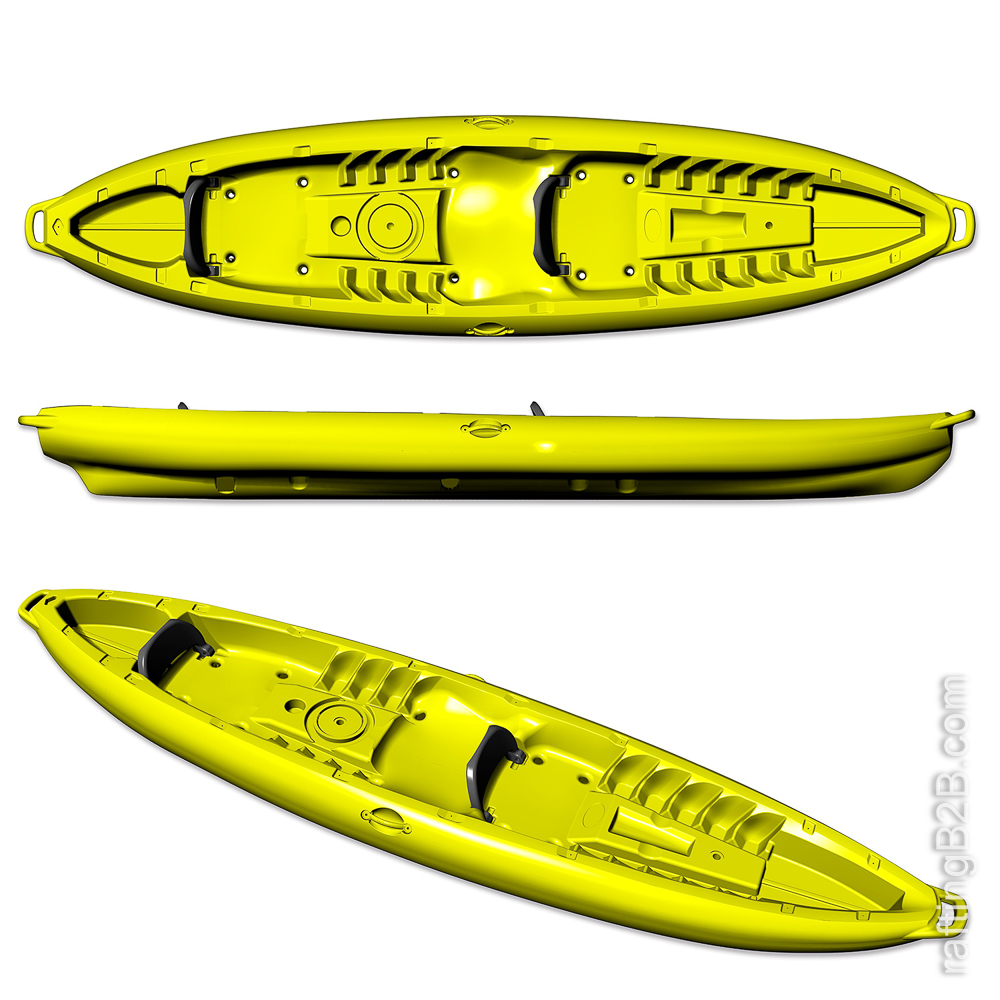 Kayak autovaciable doble compacto y estable. Gracias a su diseño permite apilarse facilmente gracias a sus formas y a que los respaldos son abatibles lo que hace que un kayak encaje a la perfeccion con el siguiente. Sus asas integradas en proa y popa la hacen manejable. En sus compactas formas cabe hasta un tercer usuario convirtiendolo en un 2+1. Un kayak que colmará de placer a sus usuarios y que se adaptará de maravilla a alquileres y empresas de actividades. Las fotos corresponden al prototipo, estará disponible en Marzo de 2026