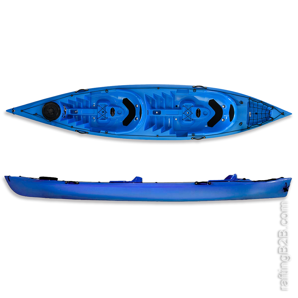 Kayak autovaciable doble ideal para su utilización en mar , lago y en general en aguas tranquilas ya que conserva muy bien el rumbo gracias a sus marcadas formas. Es muy estable y veloz lo que lo hacen idóneo para uso familiar y un gran aliado para alquileres y actividades de grupo. Es muy espacioso para su reducida eslora. Gracias a sus formas anatómicas con una zona mas alta en la zona de los riñones hacen que sea un kayak cómodo incluso sin añadir ningún tipo de respaldo adicional, respaldo que si se agradecerá en largas travesías. También disponible en una versión Base sin compartimento, linea de vida ni bases acolchadas, Consultar precio.