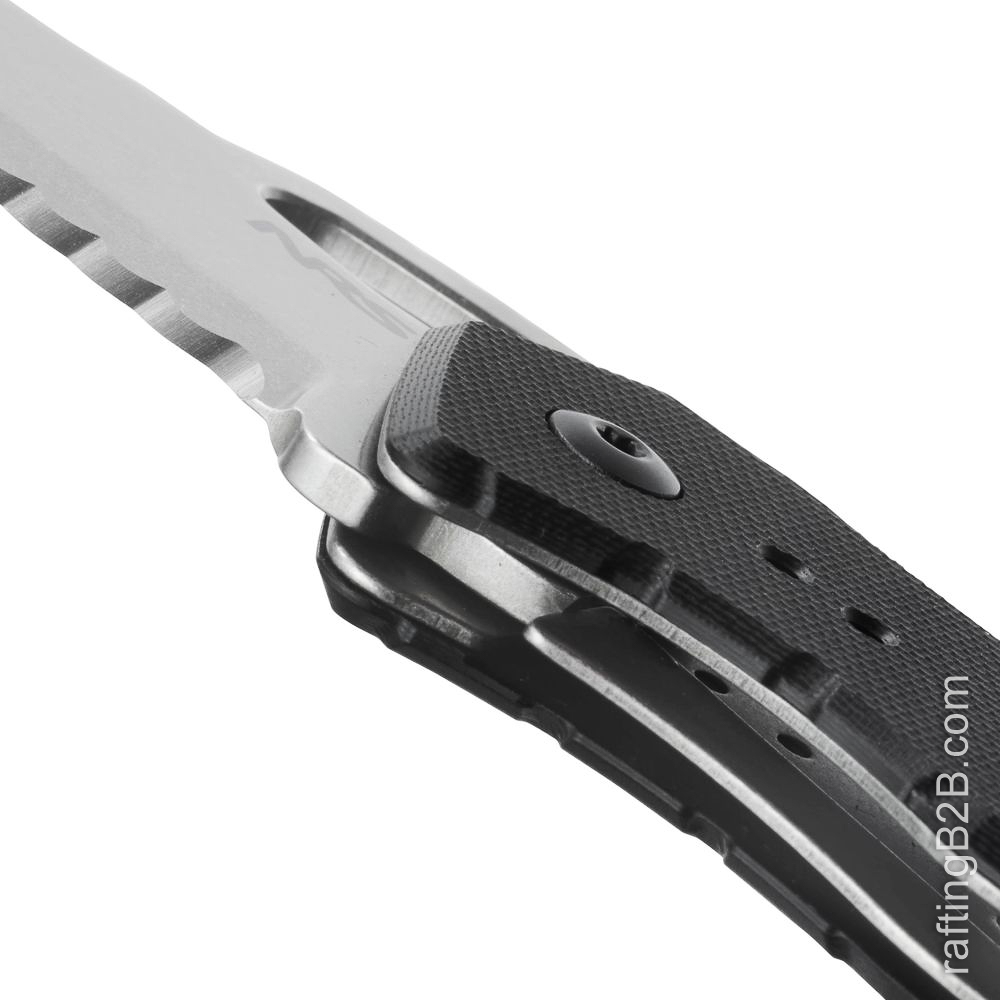 Navaja de Salvamento que gracias a su forma extremadamente plana la podremos llevar cómodamente en el bolsillo o fijada a alguna cinta del chaleco gracias a su clip metálico. Mango de goma texturizado para una máxima adherencia. La hoja esta parcialmente aserrada para cubrir todo tipo de cortes y la punta es redondeada para una máxima seguridad. Longitud Total 16 cm, Longitud de la hoja 6,5 cm.